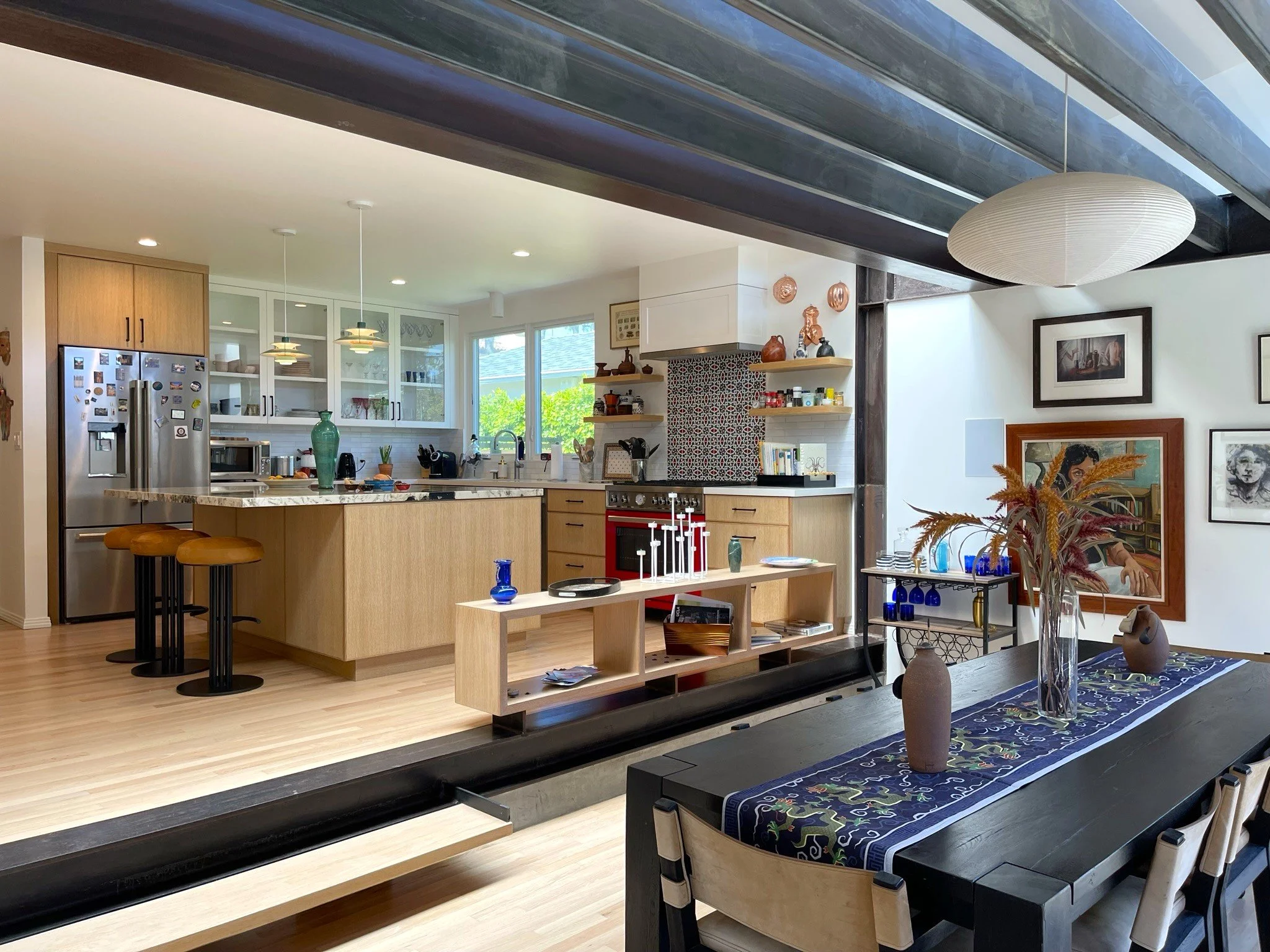 Working with these geologist clients, we focused on updating this architectural residence to reflect their love of their international backgrounds, natural textures and colors. In particular, a huge slab of granite with garnet inclusions is now the centerpiece of the home, complemented by the custom-designed stools.